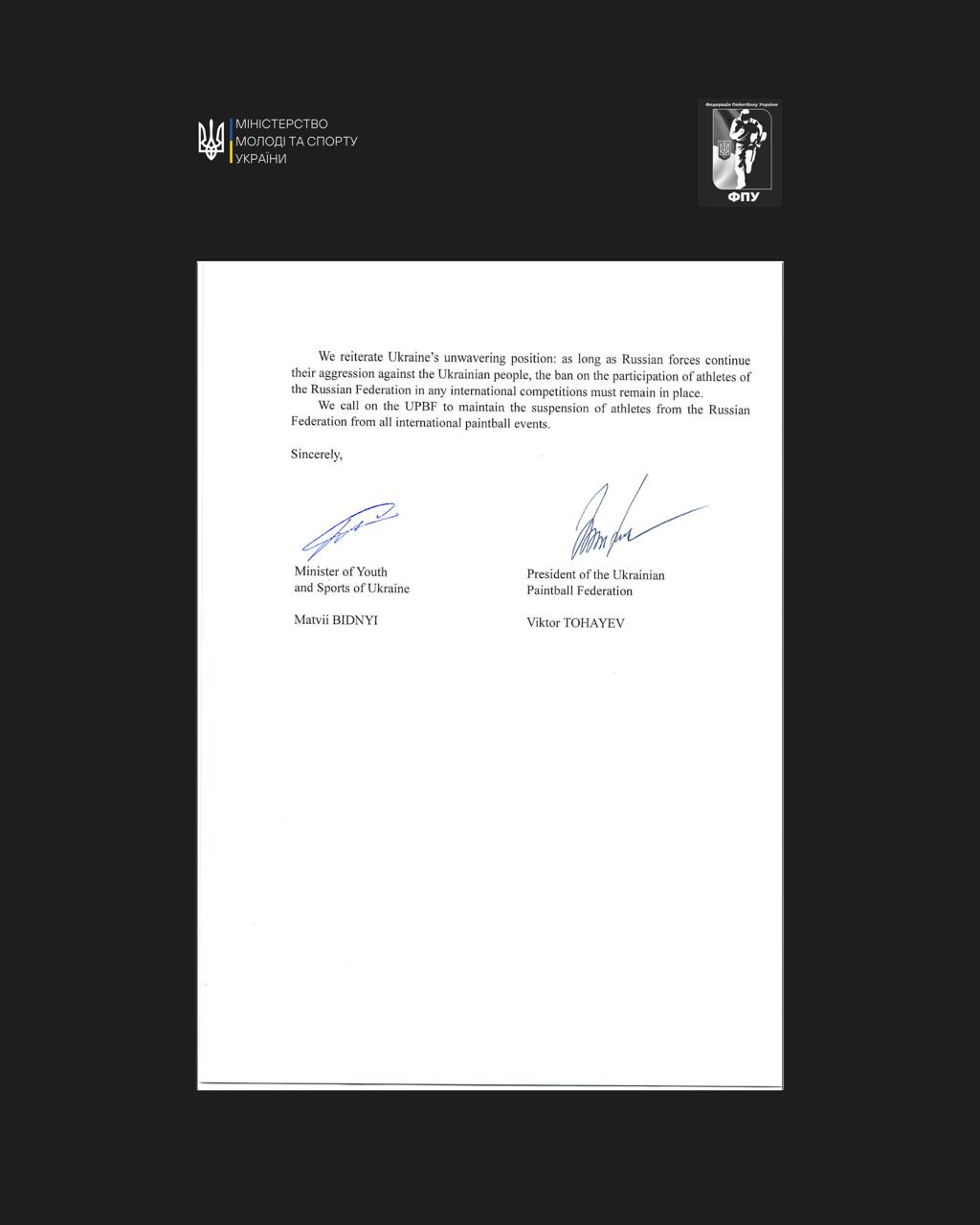 Українська сторона заявила, що допуск спортсменів російської федерації до міжнародних командних змагань є неприйнятним і підриває довіру до міжнародного спортивного руху. Збірні команди російської федерації, наголошується в заяві, не мають права брати участь у змаганнях UPBF, а будь-які рішення про їхній допуск є неприйнятними та підривають довіру до міжнародного спортивного руху.