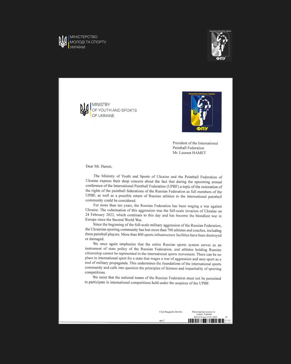 Міністерство молоді та спорту України та Федерація пейнтболу України звернулися до Президента Міжнародної федерації пейнтболу Лаурента Хамета із закликом переглянути рішення щодо можливого відновлення прав федерацій пейнтболу російської федерації та допуску спортсменів з рф до міжнародних командних змагань.